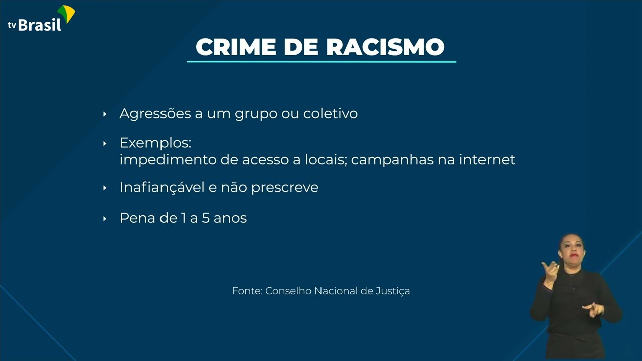 Seguindo no tema do combate ao preconceito, temos o Dia Internacional para a Eliminação da Discriminação Racial em 21 de março. No Brasil, 85% da população negra afirma já ter sofrido discriminação racial, conforme mostrou reportagem da Agência Brasil de 2025. Tanto que o Supremo Tribunal Federal (STF) já reconheceu que existe racismo estrutural no país e cobrou providências do setor público, como destacou a Radioagência Nacional, também em matéria do ano passado. Lembrando que os crimes de racismo e injúria racial são imprescritíveis. Mas, você a diferença entra os dois? Aprenda nesta reportagem do Repórter Brasil Tarde, exibida em 2022 pela TV Brasil.