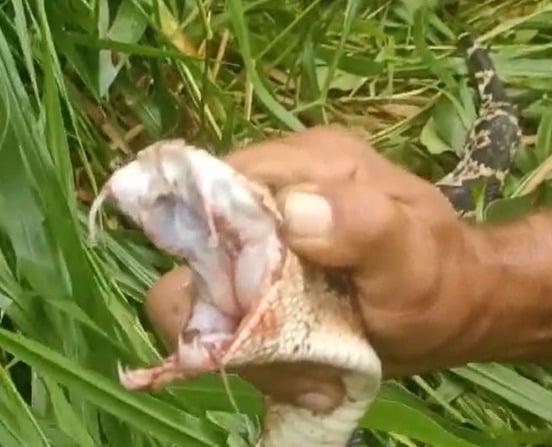 No registro, o homem aperta a região da cabeça da serpente e é possível observar o líquido sendo expelido pelas presas, evidenciando que o veneno permanece armazenado nas glândulas mesmo depois da morte do animal.