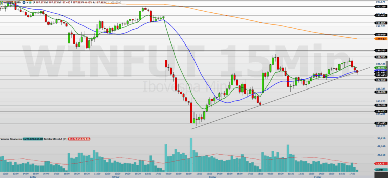 Por outro lado, a retomada do fluxo de baixa dependerá da perda da região de suporte em 187.445/184.950 pontos. Abaixo desse patamar, o contrato pode buscar 183.175/181.695 pontos, com alvos mais longos em 180.345/179.030 pontos.