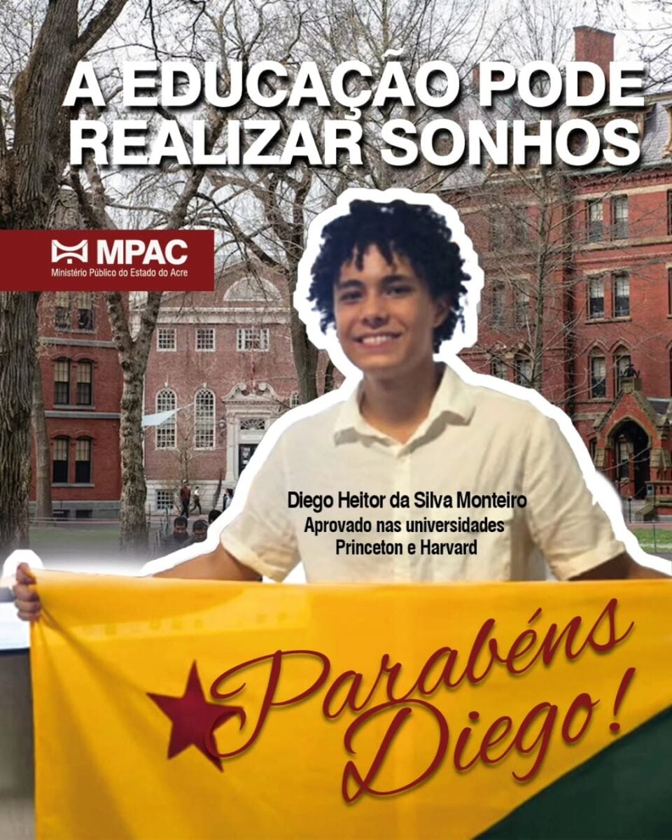 O estudante acreano Diego Heitor da Silva Monteiro, de 18 anos, voltou a ganhar destaque ao ser aprovado com bolsa integral em duas das universidades mais renomadas do mundo: Universidade de Harvard e Universidade de Princeton. A conquista foi celebrada pelo Ministério Público do Estado do Acre (MPAC), que destacou o feito como exemplo de superação e inspiração para jovens do estado.