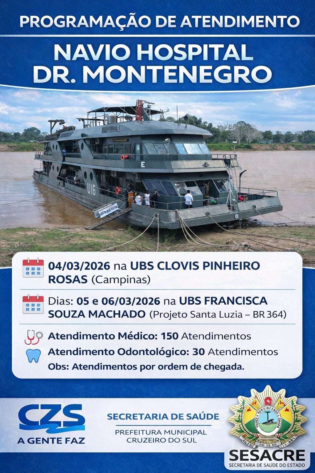 O navio hospital Navio Hospital Doutor Montenegro, da Marinha do Brasil, seguirá com os atendimentos em Cruzeiro do Sul após a baixa no nível do Rio Juruá impedir, neste momento, a navegação até Marechal Thaumaturgo.