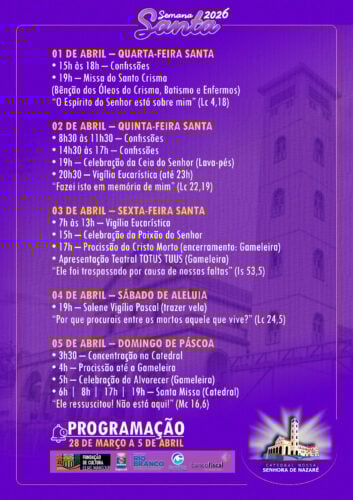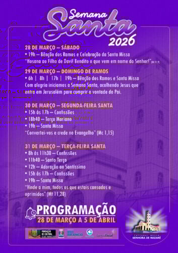 Na Diocese de Rio Branco, a programação da Semana Santa será realizada na Catedral Nossa Senhora de Nazaré e nas paróquias dos bairros.
