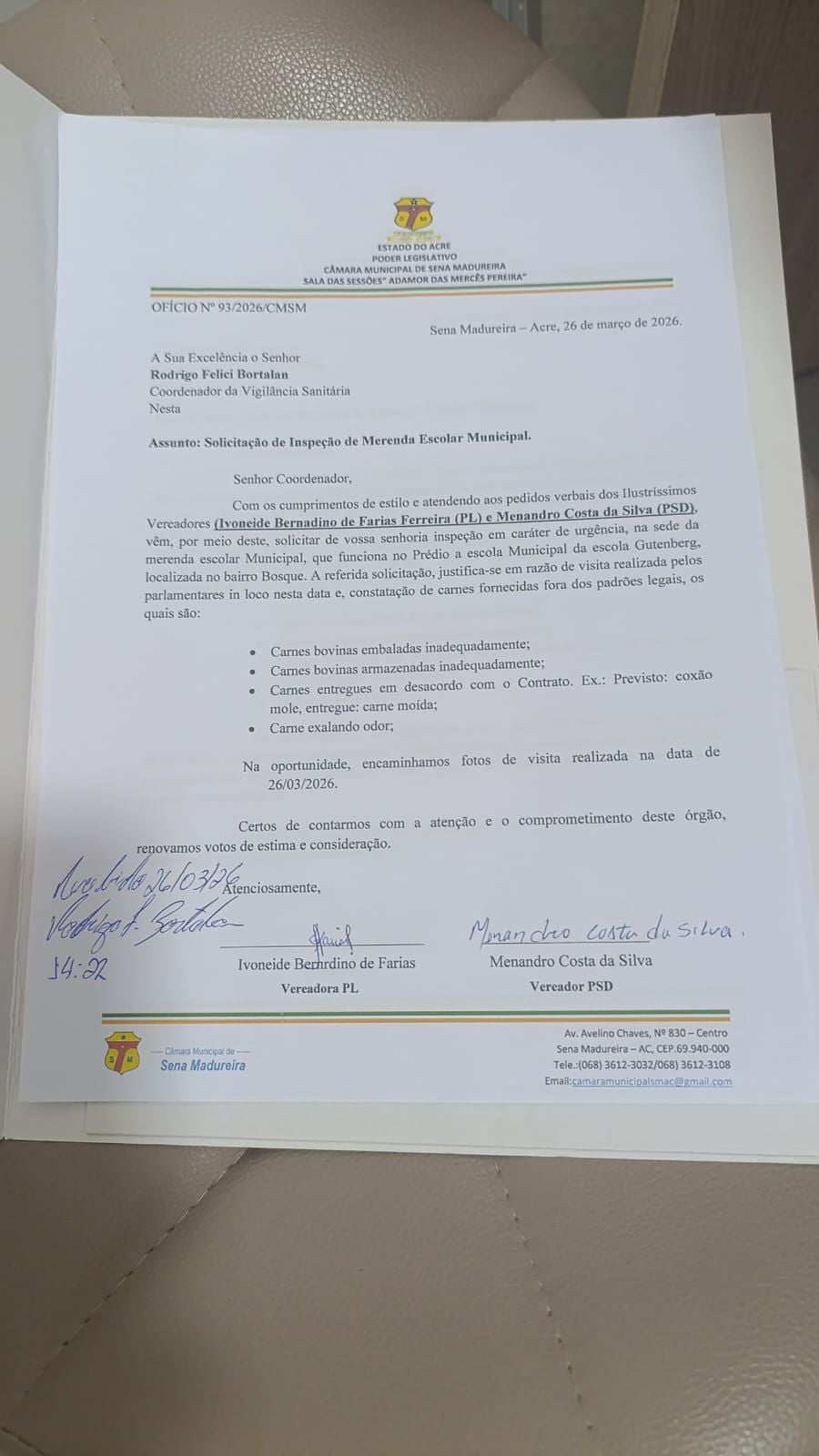 Após uma série de denúncias envolvendo a qualidade da merenda escolar em Sena Madureira, os vereadores Ivoneide Bernardino (PL) e Menandro Costa (PSD) realizaram, na manhã desta quinta-feira (26), uma visita ao setor de armazenamento de alimentos da rede municipal. O local funciona no prédio da antiga escola Guttemberg Modesto da Costa.
