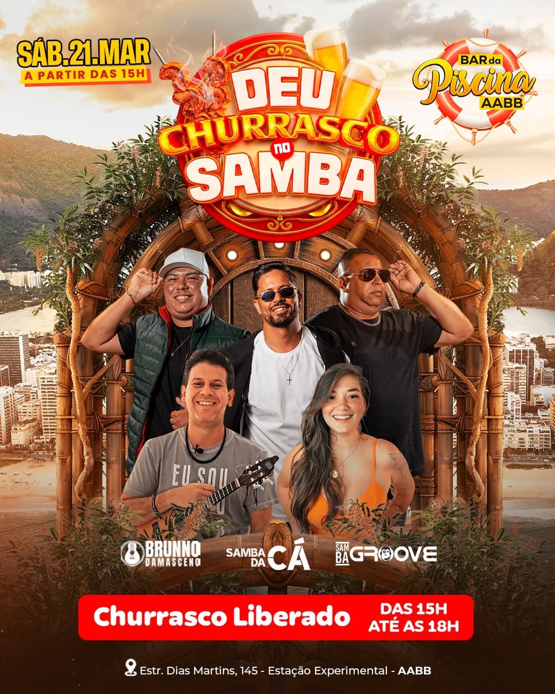 Deu churrasco no samba! O Bar da Piscina da AABB recebe, das 15h às 18h, os cantores Brunno Damasceno, Samba da Cá e Samba Groove, com churrasco liberado.