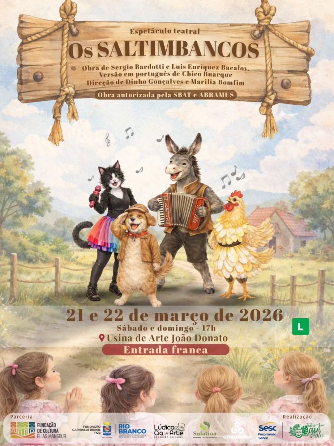 Ainda no teatro, o grupo do Palhaço Tenorino (GPT) apresenta o Espetáculo Os Saltimbancos. Em comemoração aos 35, o grupo realiza a montagem do espetáculo apresentado em 1998, agora com os filhos encenando personagens que os pais fizeram há décadas. A apresentação acontece no sábado e domingo, 21 e 22 de março, às 17h, na Usina de Arte João Donato. A entrada, que é gratuita, será por ordem de chegada e após a lotação do teatro, não será permitida a entrada de mais pessoas. A organização recomenda chegar cedo.
