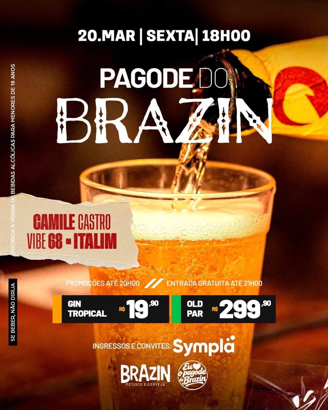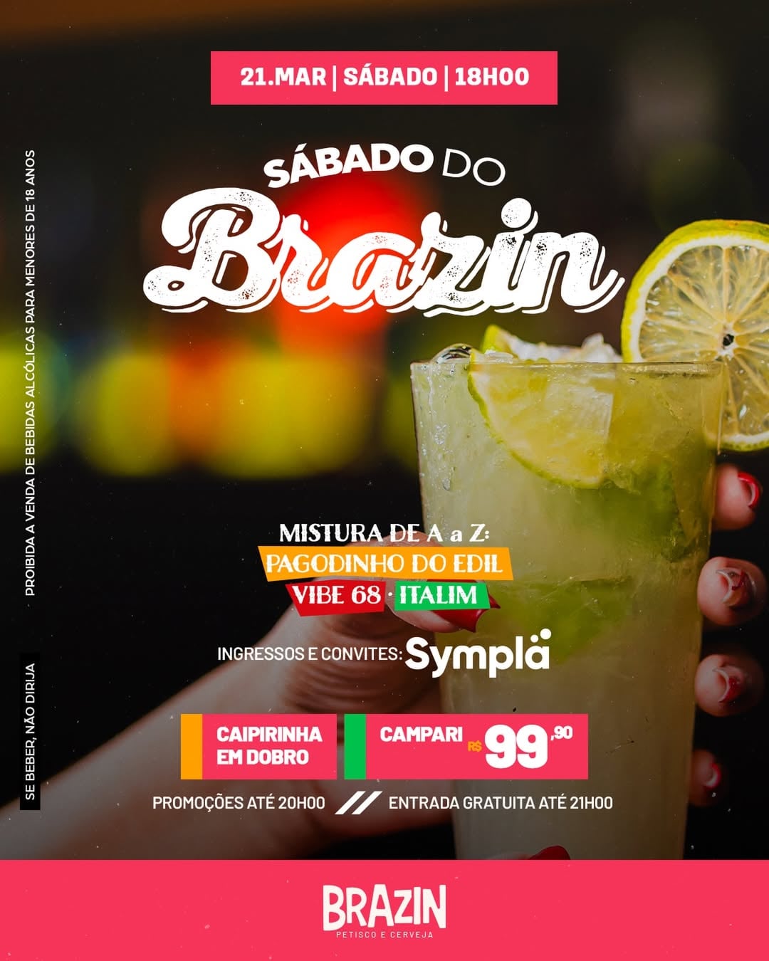 No sábado, a partir das 18h, acontece a Mistura de A a Z: Pagodinho do Edil, Vibe 68 e Italim no Brazin. As promoções de caipirinha em dobro e campari por R$ 99,90 são até às 20h. A entrada é gratuita até às 21h. Os convites e ingressos estão disponíveis na Plataforma Sympla.