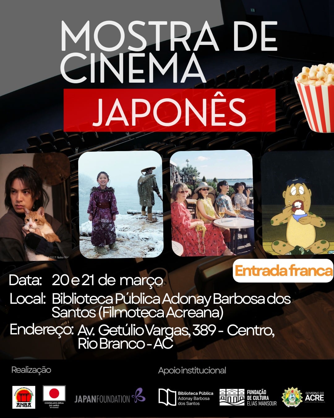 Aos amantes de filme japonês, preparem-se! O Consulado-Geral do Japão em Manaus, em parceria com a Fundação Japão e a Fundação de Cultura Elias Mansour, realiza a Mostra de Cinema Japonês na Filmoteca Acreana, nos dias 20 e 21 de março.