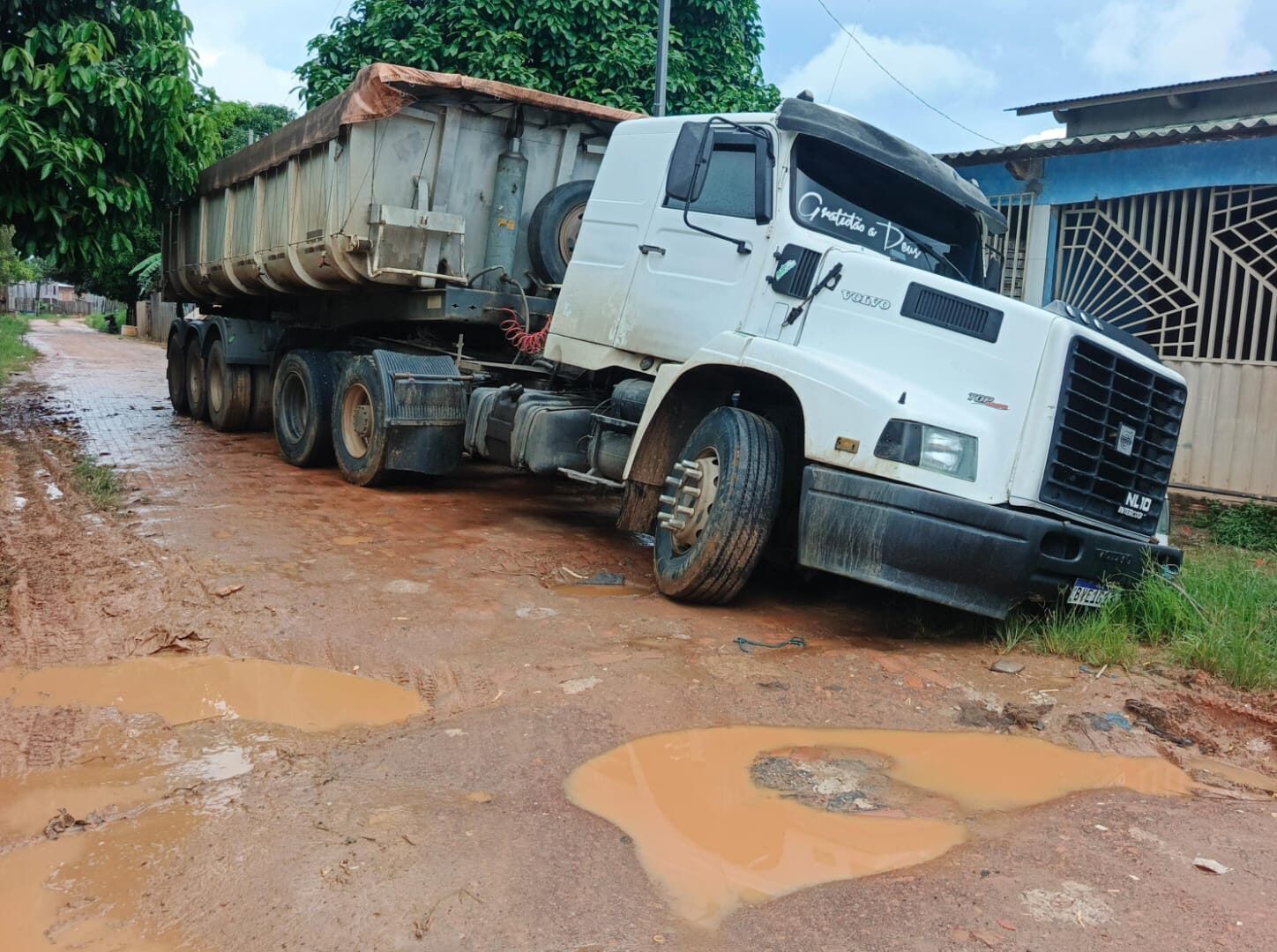 Um caminhão acabou ficando preso na sexta-feira (03) após parte da via ceder no bairro Vitória, em Sena Madureira, causando transtornos para moradores e motoristas que precisavam passar pelo local.
