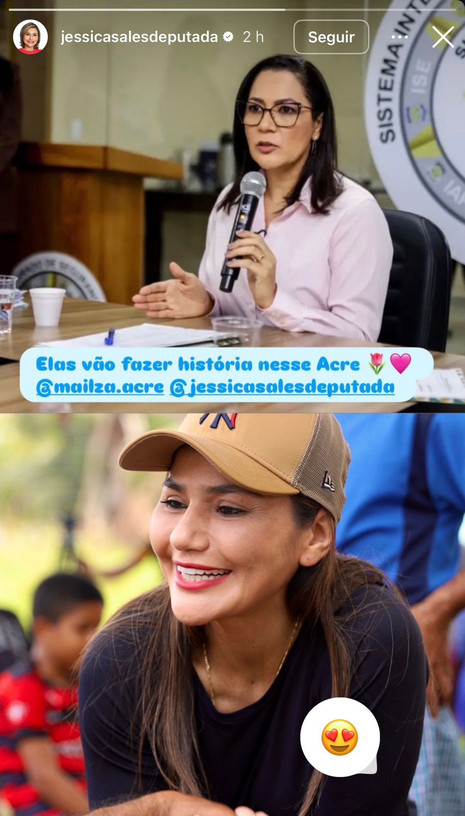 Um dia após Mailza Assis assumir oficialmente o Governo do Acre, a ex-deputada federal Jéssica Sales, cotada como possível vice em sua chapa na disputa eleitoral, movimentou o cenário político ao publicar uma montagem das duas nas redes sociais nesta sexta-feira (3). Na legenda, escreveu: “elas vão fazer história nesse Acre”.