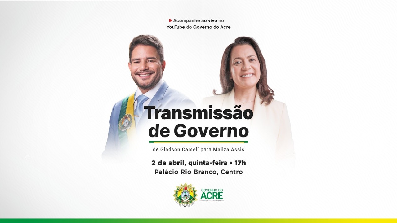 A noite desta quinta-feira, 2 de abril de 2026, marca uma nova página na história do Acre. O governador Gladson Camelí fará a transmissão do governo do Acre para Mailza Assis, em frente ao Palácio Rio Branco.