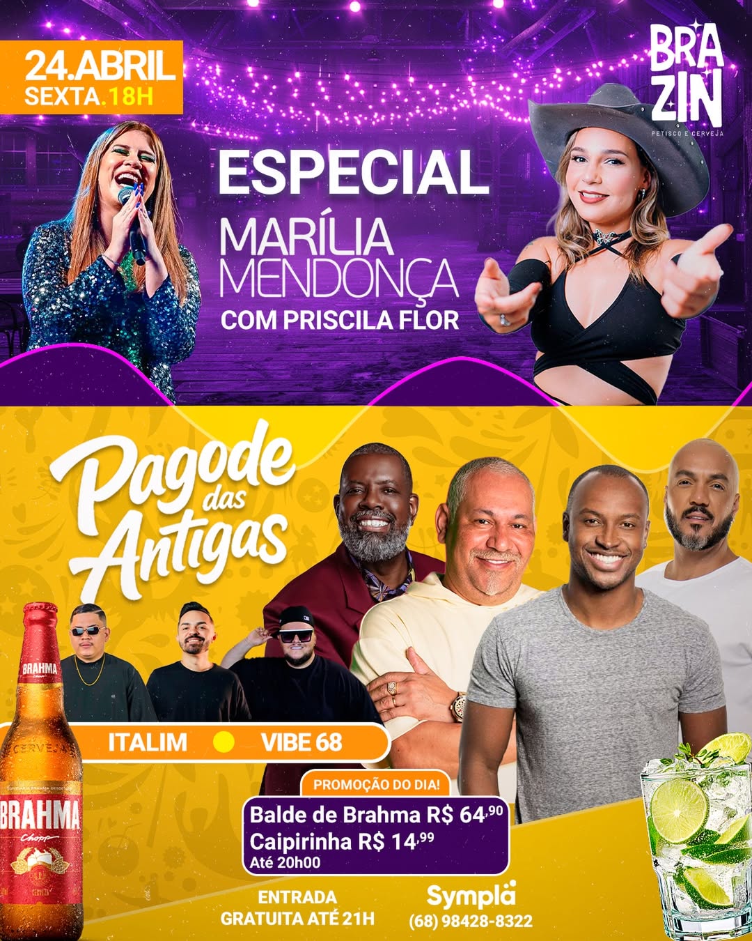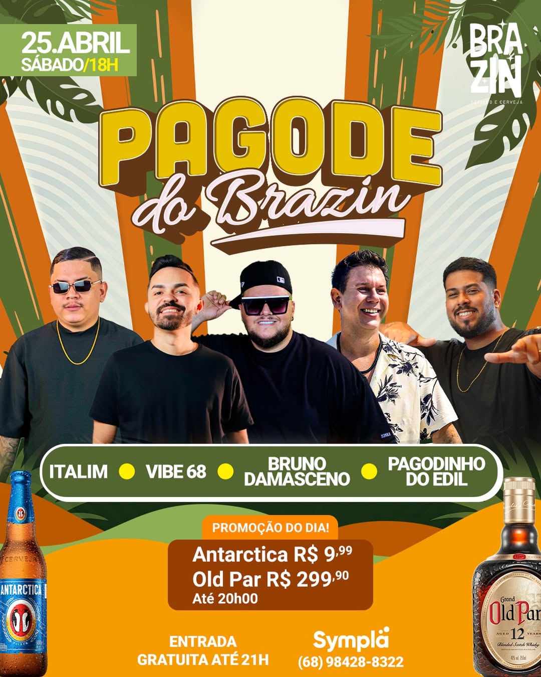 O Brazin faz o Pagode do Brazin com Italim, Vibe 68, Brunno Damasceno e Pagodinho do Edil, a partir das 18h. A promoção do dia serå até às 20h, com Antårtica R$ 9,99 e Old Par R$ 299,90. A entrada serå gratuita até às 21h, e os ingressos podem ser adquiridos pela plataforma Sympla ou pelo contato (68) 98428-8322.