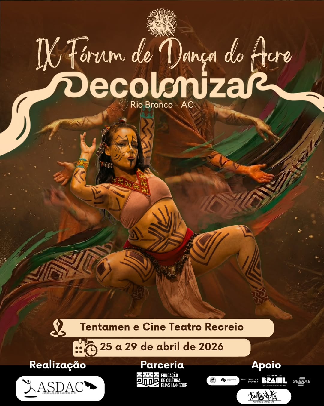 ASDAC anuncia o IX Fórum de Dança do Acre, este ano sob o tema Decolonizar. Na Tentamen e Cine Teatro Recreio, de 25 a 29 de abril de 2026.