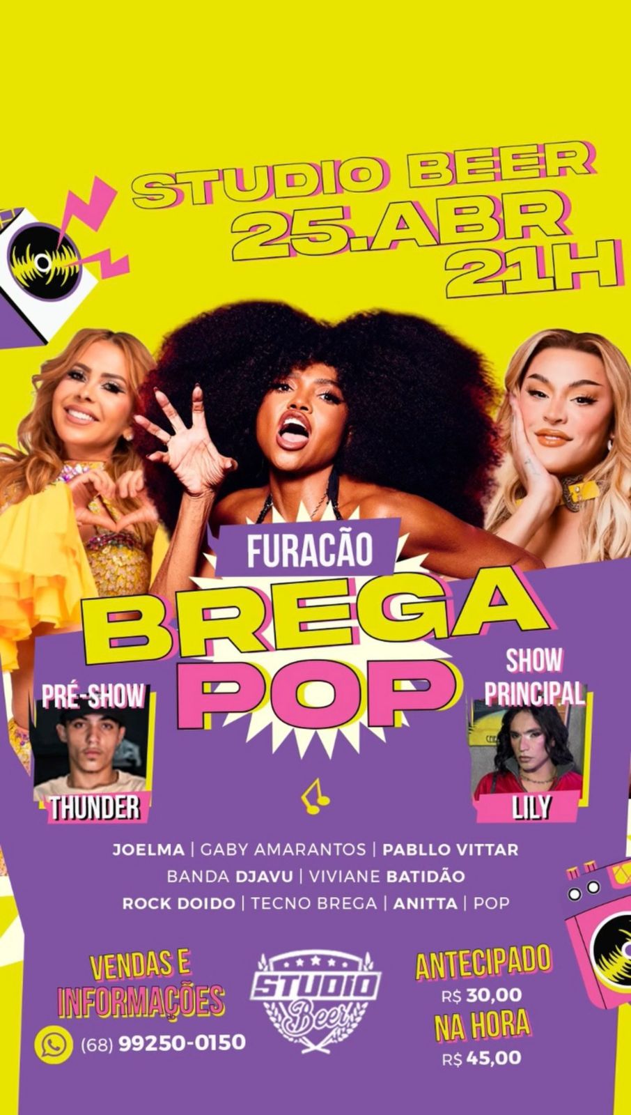 O Studio Beer promove, neste sĂĄbado (25), a partir das 21h, o Brega Pop com calypso, rock doido e ao som de Joelma, Gaby Amarantos, Banda Djavu, Viviane BatidĂŁo, Pabllo Vittar, Anitta e mais. Os ingressos antecipados custam R$ 30,00 e na hora custarĂĄ R$ 45,00, vendas pelo contato (68) 99250-0150.