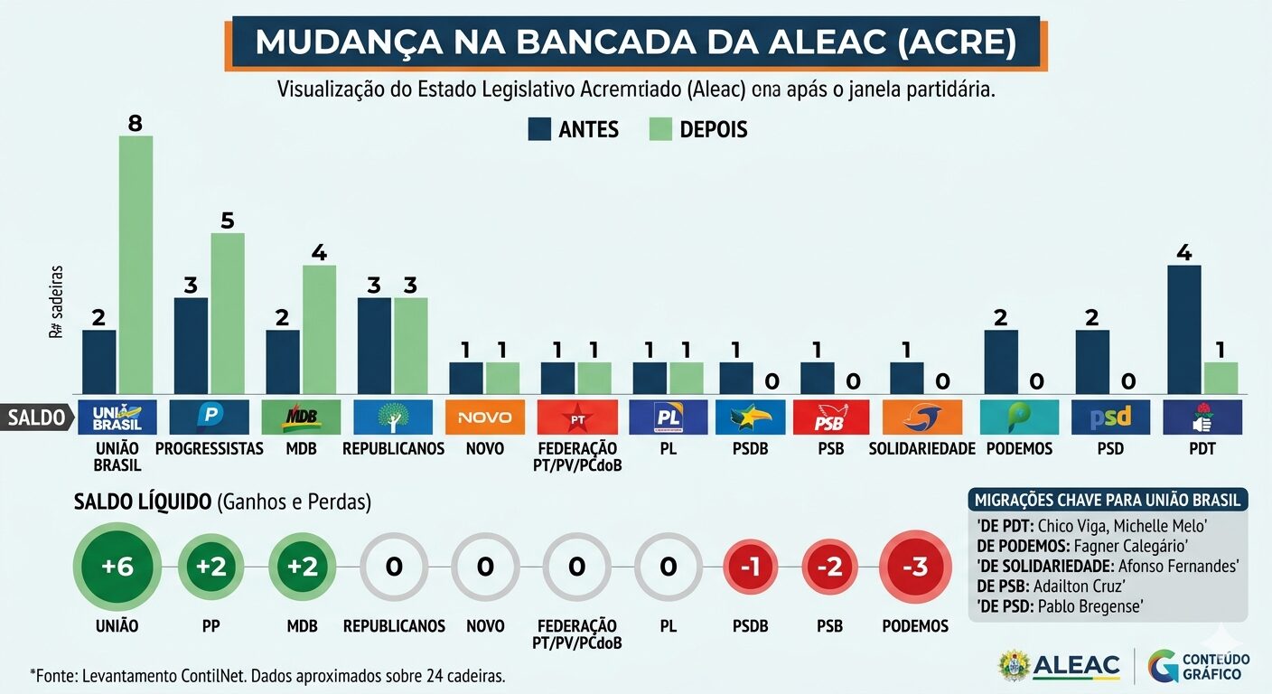 O fim da janela partidária, encerrada no último sábado (5), provocou uma reconfiguração significativa na composição da Assembleia Legislativa do Acre (Aleac). O período, previsto na legislação eleitoral, permite que parlamentares troquem de partido sem risco de perder o mandato por infidelidade partidária, desde que respeitado o prazo estabelecido antes das eleições.