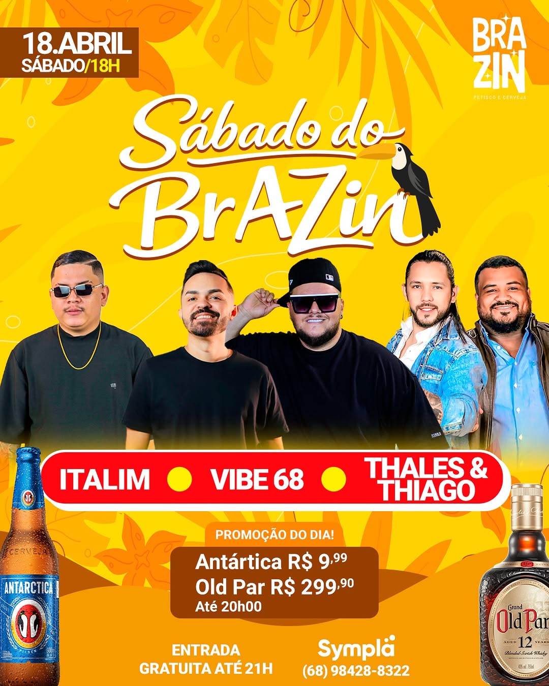 O Brazin faz o Sábado do Brazin com Italim, Vibe 68, Thales & Thiago, a partir das 18h. A promoção do dia será até às 20h, com Antártica R$ 9,99 e Old Par R$ 299,90. A entrada será gratuita até às 21h, e os ingressos podem ser adquiridos pela plataforma Sympla ou pelo contato (68) 98428-8322.