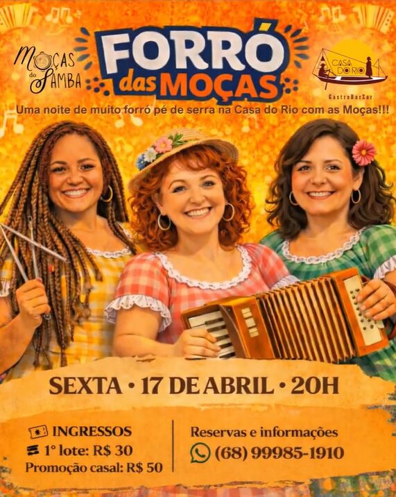 Nesta sexta-feira, às 20h, o grupo Moças do Samba faz o Forró das Moças na Casa do Rio. Os ingressos no 1º lote custam R$ 30,00, para casal, o valor promocional é de R$ 50,00. As reservas e informações podem ser realizadas pelo contato (68) 99985-1910.