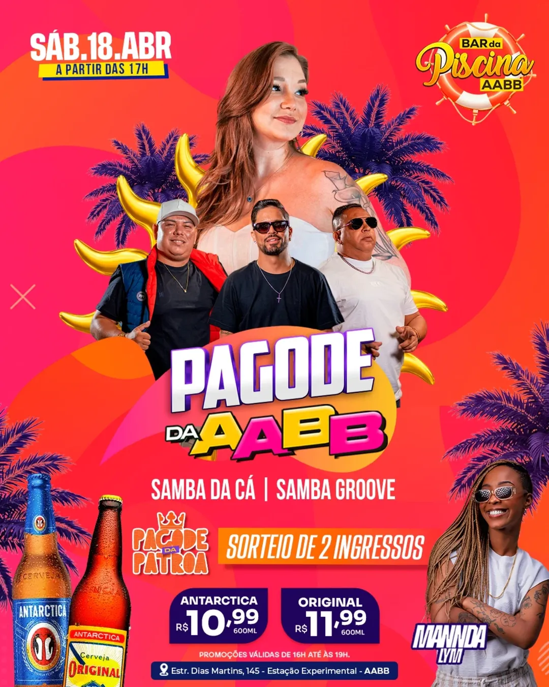 O Bar da Piscina da AABB realiza o Pagode da AABB neste sábado (18), a partir das 17h. As promoções de Artartica no valor R$ 10,99, e Original por R$ 11,99. Neste sábado também serão sorteados dois ingressos para o show Pagode da Patroa, com Samba da Cá, Mannda Lym e A Farra.