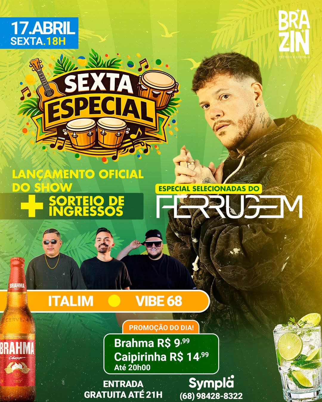 Nesta sexta-feira (17), o Brazin faz o lançamento oficial do show do Ferrugem e sorteio de ingressos, com Italim e Vibe 68, com promoção do dia Brahma, no valor de R$ 9,99, Caipirinha, no valor R$ 14,99, até 20h. A entrada é gratuita até 21h e os ingressos podem ser retirados pelo Sympla ou pelo contato (68) 98428-8322.