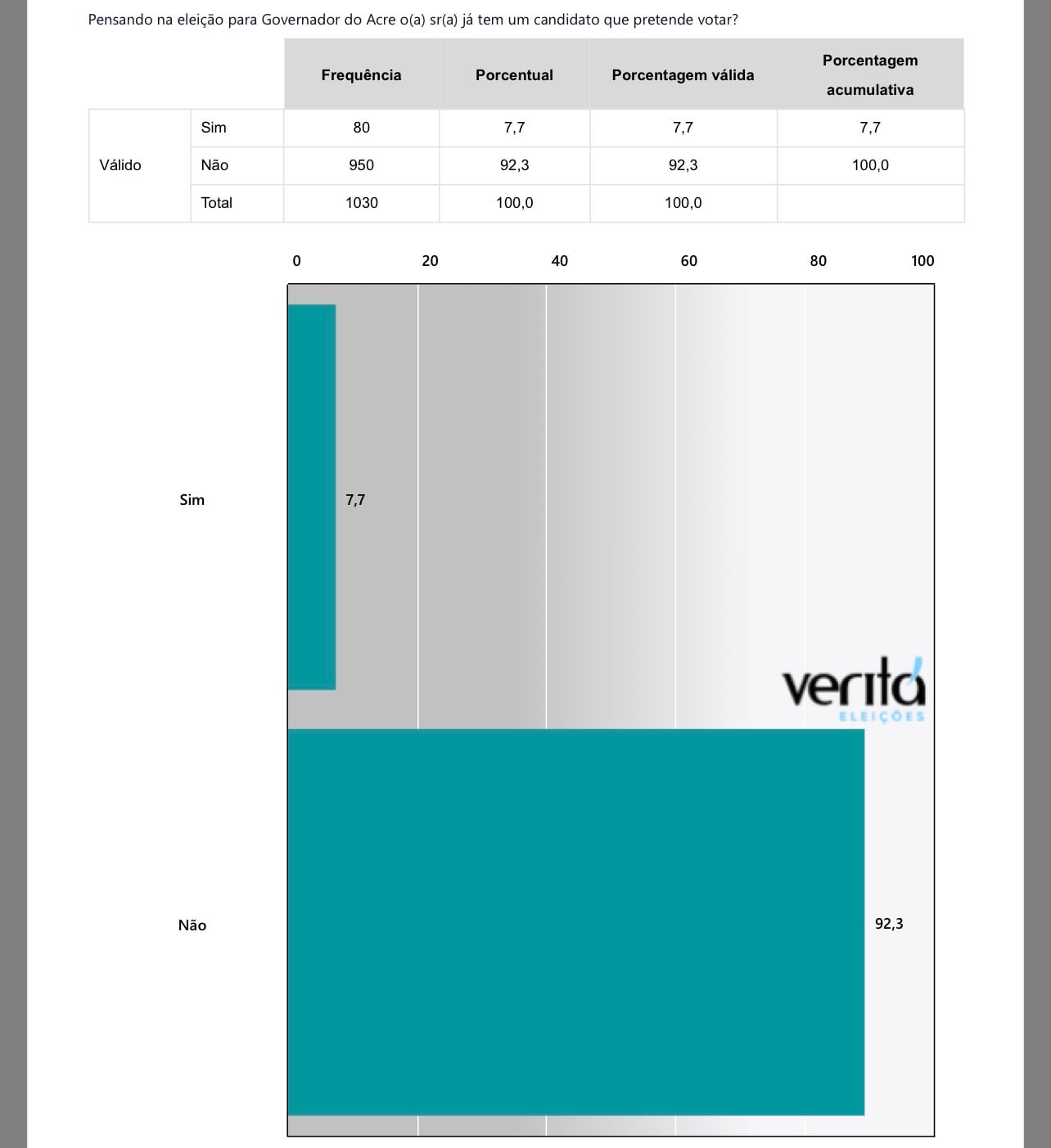 Uma pesquisa divulgada pelo Instituto Veritá nesta quinta-feira (2) mostra que a maioria dos eleitores acreanos ainda não definiu em quem pretende votar para o governo do Estado nas eleições de 2026. De acordo com o levantamento, 92,3% dos entrevistados afirmaram não ter um candidato, enquanto apenas 7,7% disseram já ter escolhido.