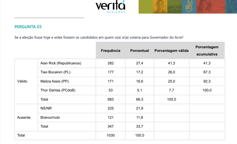 Em uma das perguntas, chamada de estimulada, o entrevistado aponta qual dos nomes votaria para governador: 41,3% votaria em Alan Rick (Republicanos), 26% votaria em Tião Bocalom (PSDB), 25% votaria em Mailza Assis (PP) e 7,7% votaria em Thor Dantas (PCdoB). NS/NR são 21,9% e branco/nulo representam 11,8%.
