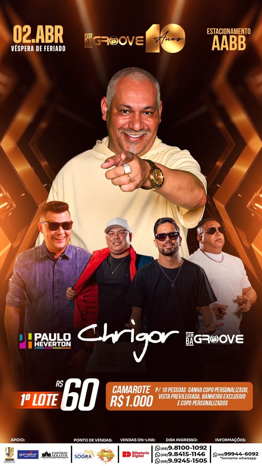 A cidade se prepara para uma noite especial de muito samba e pagode no próximo dia 2 de abril, véspera de feriado. O cantor Chrigor, conhecido por sua trajetória marcante no gênero, será a principal atração da festa que comemora os 10 anos do projeto Samba Groove.