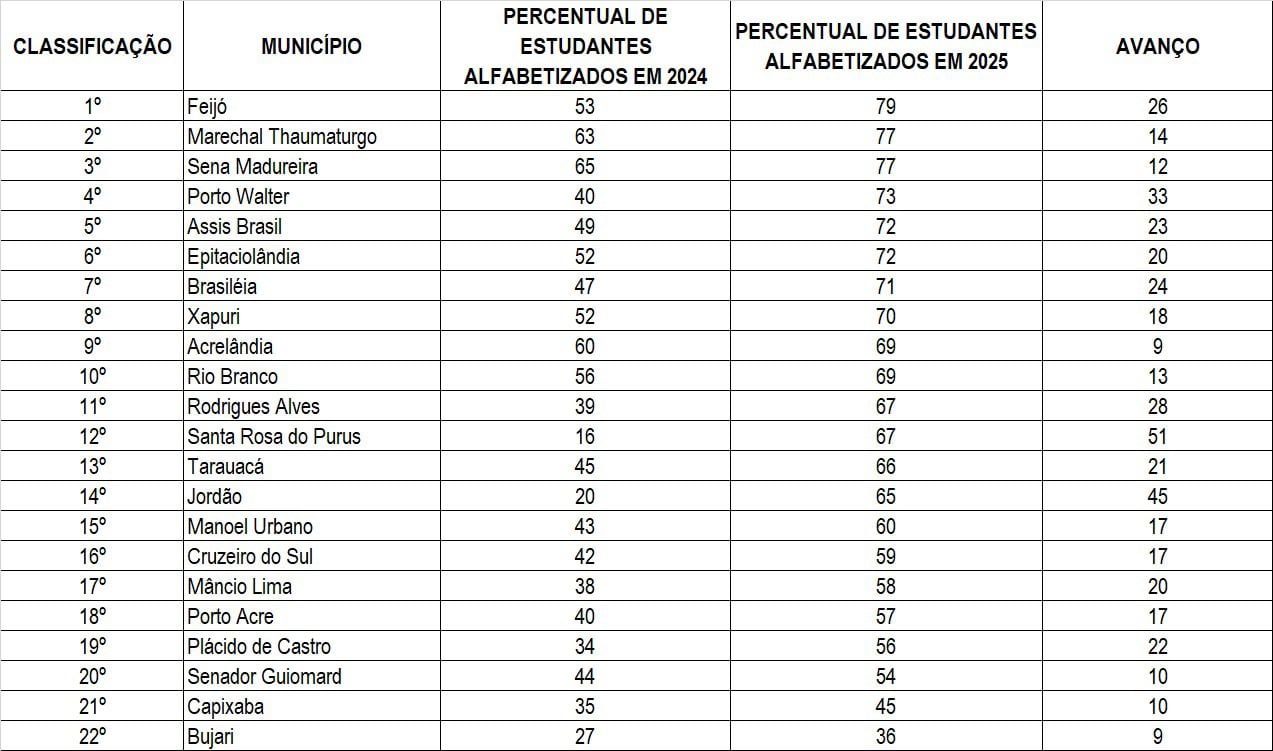 Os resultados do Indicador Criança Alfabetizada (ICA), divulgados pelo Ministério da Educação (MEC) em 31 de março de 2026, colocam o Município de Feijó como líder em alfabetização no Estado do Acre. Com um impressionante avanço de 26%, a taxa de alfabetização no município saltou de 53% em 2024 para 79% em 2025, superando as metas projetadas para 2029.