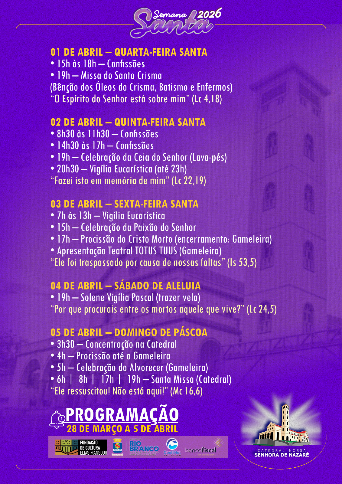 Confira a programação da Catedral Nossa Senhora de Nazaré, divulgada pela Diocese de Rio Branco: