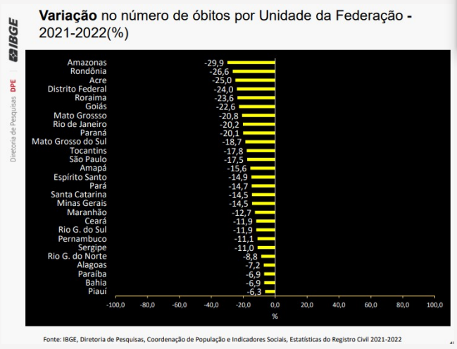 A mortalidade também tem diferença no recorte por sexo. Entre 2021 e 2022, a redução relativa do número de óbitos femininos (-25,5%) foi superior à masculina (-25,1%).