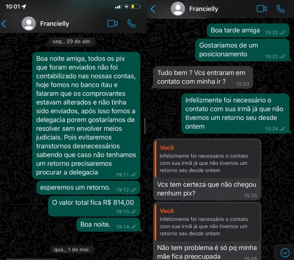 Ao cobrar o pagamento, Renato disse que foi “enrolado” pela cliente. Dias depois, ele ficou sabendo pelo dono de outro estabelecimento, ao qual Francielly também devia dinheiro, que ela já havia mandado mensagem no WhatsApp dizendo que tinha morrido após complicações causadas por uma cirurgia que teria precisado fazer depois de ter sofrido um suposto acidente.