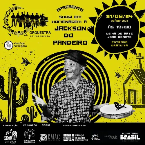 No próximo dia 31 de agosto (sábado), às 19h30, na Usina de Arte João Donato, a Orquestra de Percussão realizará um show em homenagem ao músico, compositor e instrumentista Jackson do Pandeiro.
