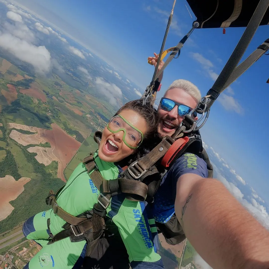 Sandy Monteiro: Um pouco dos dois! Desde criança, eu sempre tive esse sonho. Gosto de me aventurar, me desafiar e buscar experiências que me façam sentir viva. Quando planejamos a viagem para São Paulo, incluímos o salto de paraquedas porque Boituva fica super perto. Foi a oportunidade perfeita.