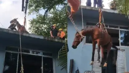 Segundo a tutora, o cavalo subiu pela escada de cimento que dá acesso à laje. No entanto, com a alta das águas, o animal não conseguiu descer.