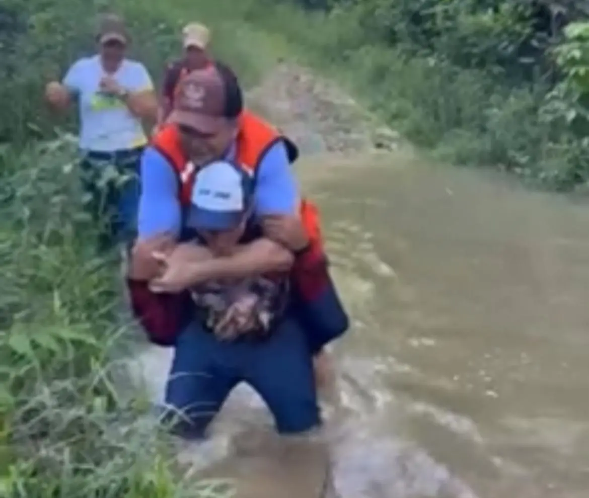 Nas imagens é possível ver o vereador tentando atravessar o córrego com o prefeito nas costas