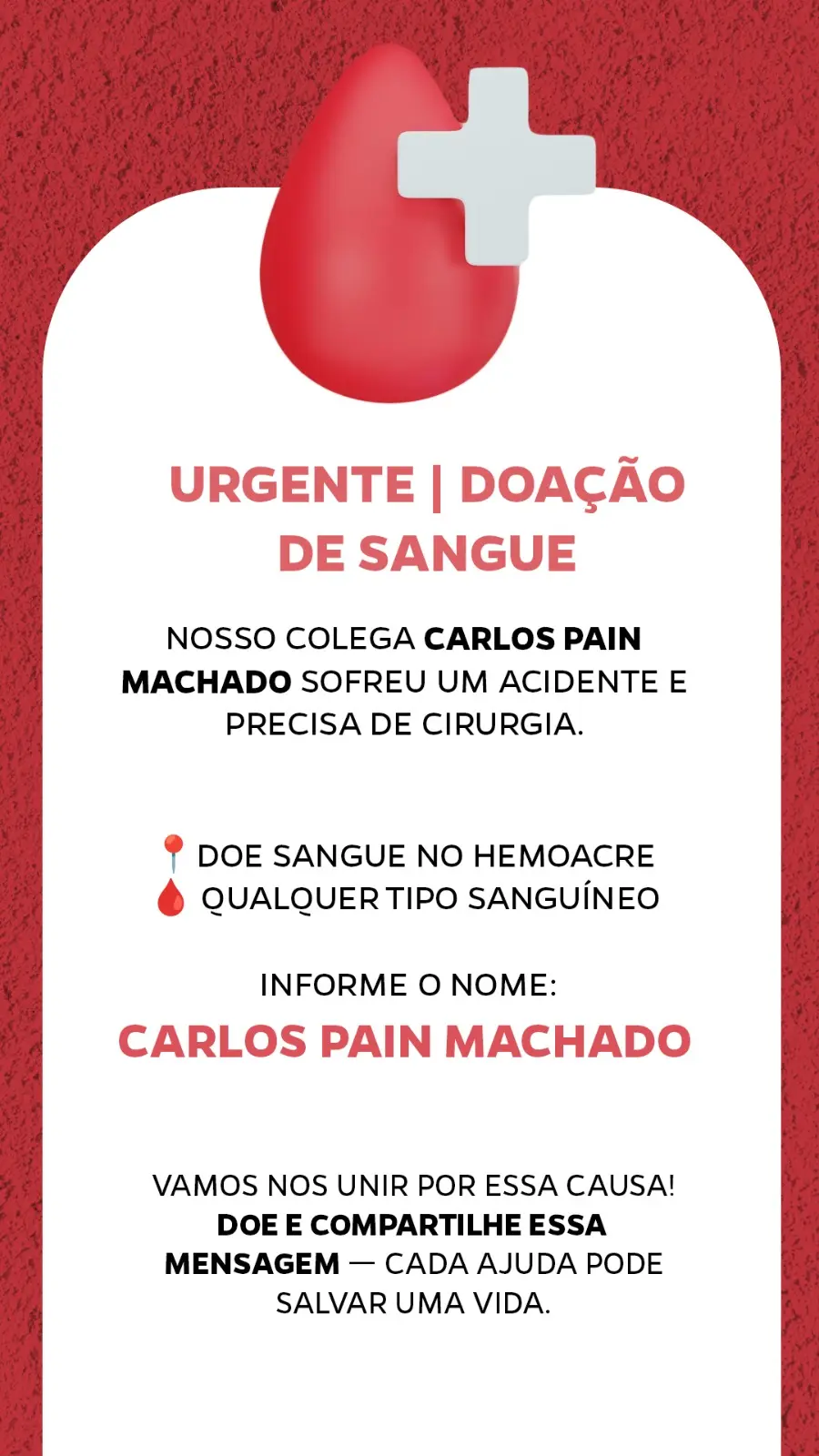 Uma mobilização solidária foi iniciada em Rio Branco para ajudar o colega Carlos Pain Machado, que sofreu um acidente e está internado precisando de cirurgia. A família e amigos pedem o apoio da população com doações de sangue no Hemoacre, independentemente do tipo sanguíneo.