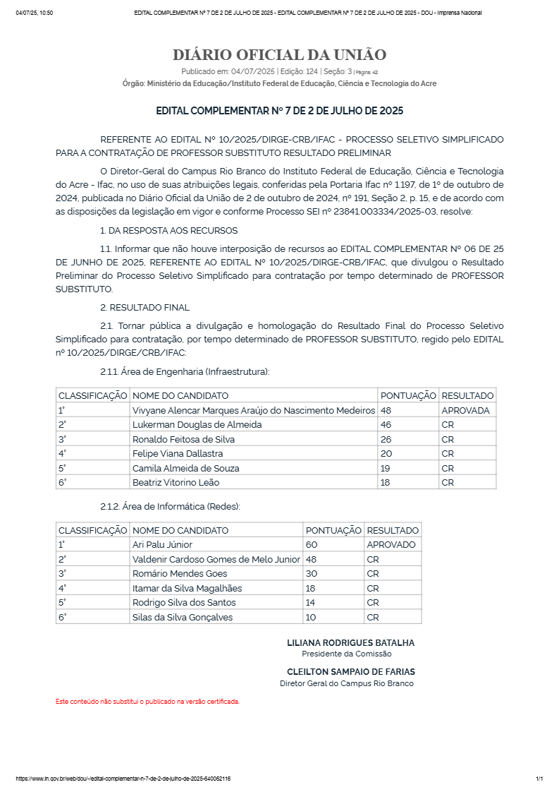 A lista definitiva de classificados foi assinada por Liliana Rodrigues Batalha, presidente da comissão do processo seletivo, e pelo diretor-geral do campus, Cleilton Sampaio de Farias. A publicação também destaca que os candidatos aprovados como cadastro reserva poderão ser convocados futuramente, de acordo com a demanda do campus. O resultado final está disponível para consulta veja:
