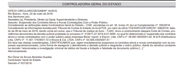 A ordem obedece uma recomendação do Tribunal de Contas do Estado (TCE) que se baseou em uma decisão judicial do Tribunal de Justiça do Acre no processo 010011-27.2019, orientando o Estado a suspender os contratos vigentes e proíbe de realizar novas contratações com as empresas Biolar Import. e Export. Ltda, M. & R. Distribuidora Ltda e Moura & Cia. Ltda.