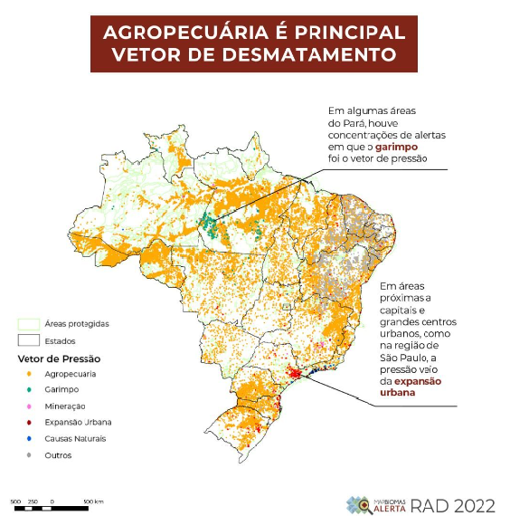 O Relatório Anual do Desmatamento do Brasil (RAD 2022) revelou que a agropecuária respondeu por 6.743.328,500 hectares de terra desmatadas no Acre, o que corresponde a 99% do total de todo o estado, consolidando-se como o principal vetor de supressão de vegetação nativa.