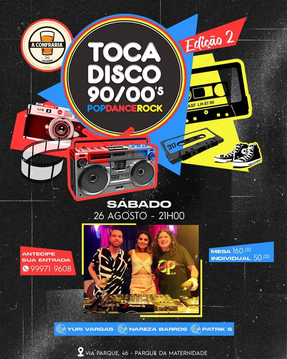 A Confraria Gastrobar está entusiasmada em apresentar a tão aguardada segunda edição do evento ‘Toca Disco’. Uma noite que promete transportar os amantes de flashbacks musicais para uma jornada através dos ritmos pop, dance e rock. Sob o comando dos DJs residentes, Yuri Vargas, Nareza Barros e Patricks, o set promete ser uma viagem musical pelos anos 90 e 2000, com a possibilidade empolgante de também reviver os encantos sonoros dos anos 60 e 70. Prepare-se para uma noite de nostalgia e boa música, onde as batidas do passado se fundem harmoniosamente com o presente.
