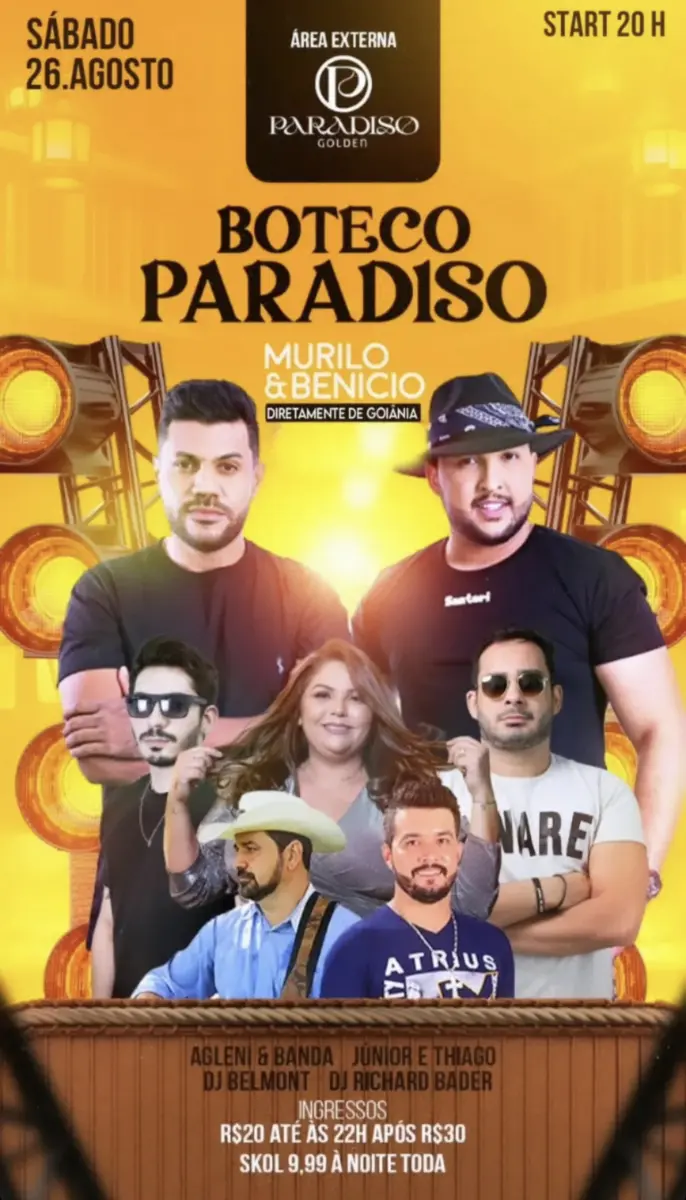 Neste sábado, dia 26, a casa noturna Paradiso Golden em Rio Branco, no Acre, será palco de um evento imperdível: o Boteco Paradiso. A atração principal da noite será o aguardado show nacional de Murilo e Benício, diretamente de Goiânia. Prepare-se para uma noite repleta de música e diversão!