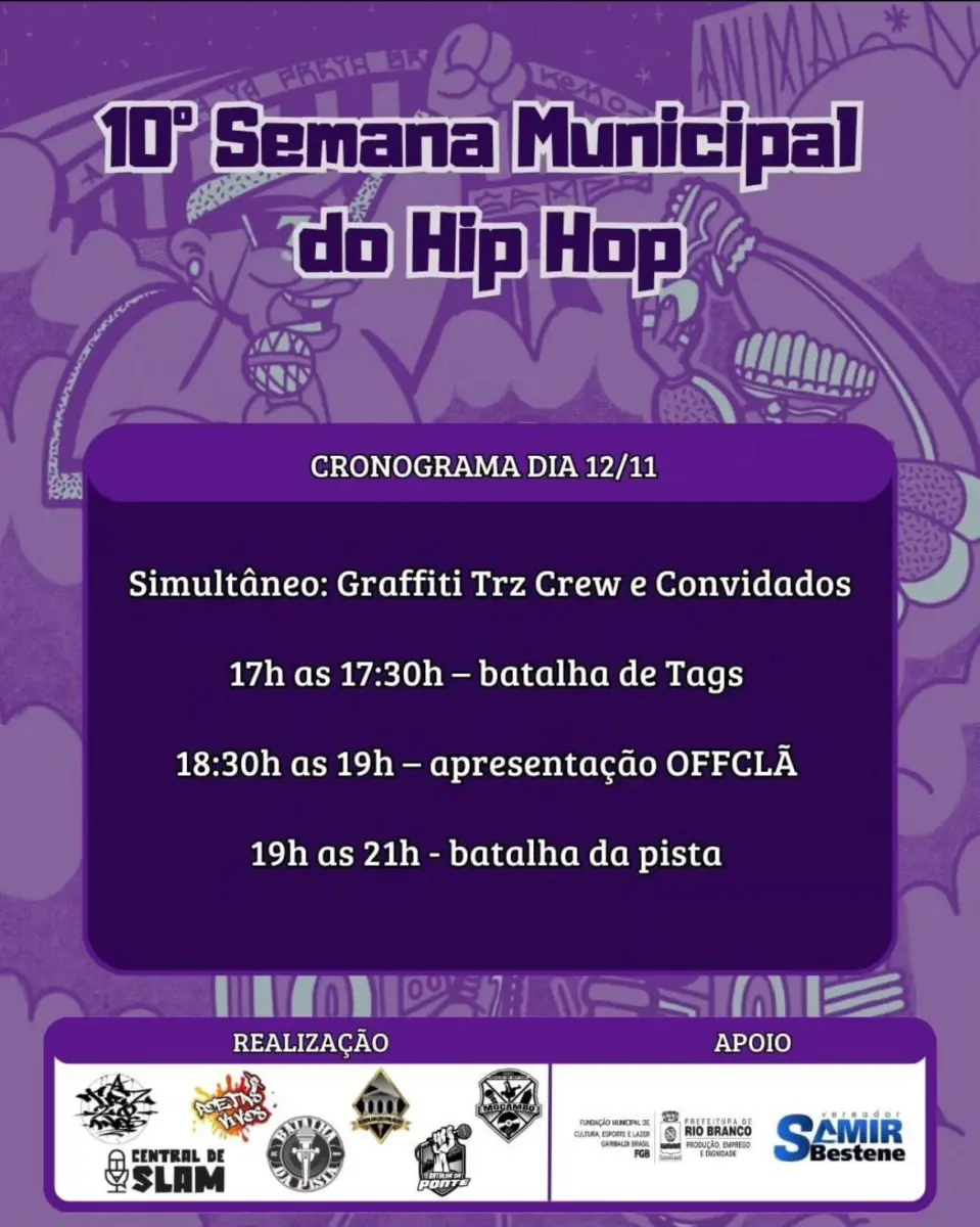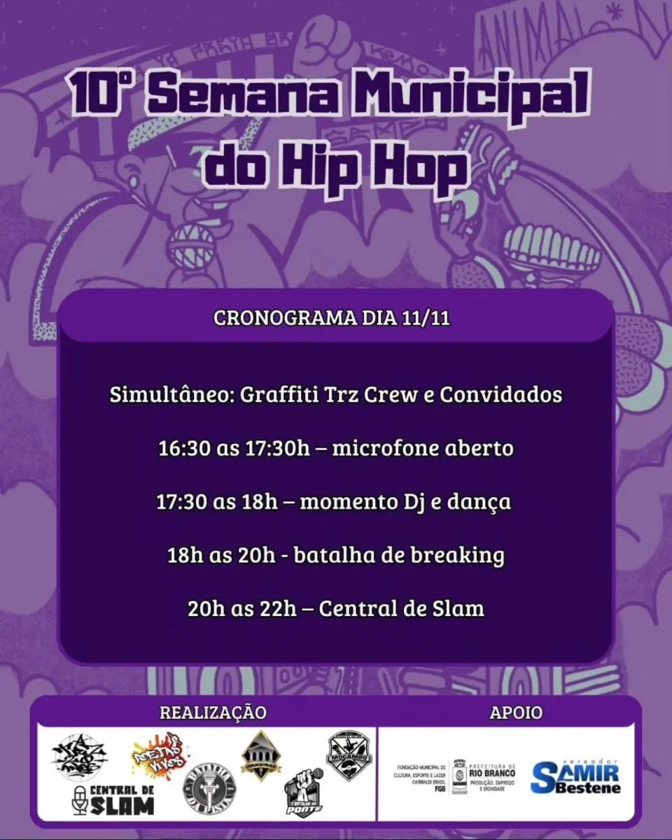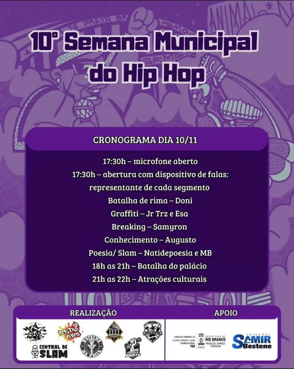 O fim de semana em Rio Branco já tem lazer, entretenimento e cultura garantidos, com a realização da 10º Semana Municipal de Hip Hop. Vai acontecer sexta-feira (10), sábado (11) e domingo (12), a partir das 17h30, na Praça da Capoeira, no Canal da Maternidade, próximo ao Tacacá da Base.