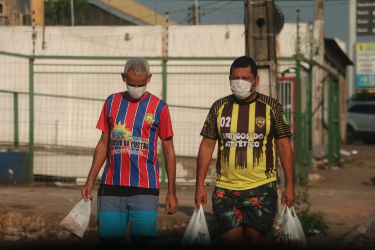 Cena da cidade: Homens caminham usando máscara em Rio Branco, para se protegerem na intensa fumaça causada pelas queimadas. O número de registros de incêndios florestais na capital do Acre
