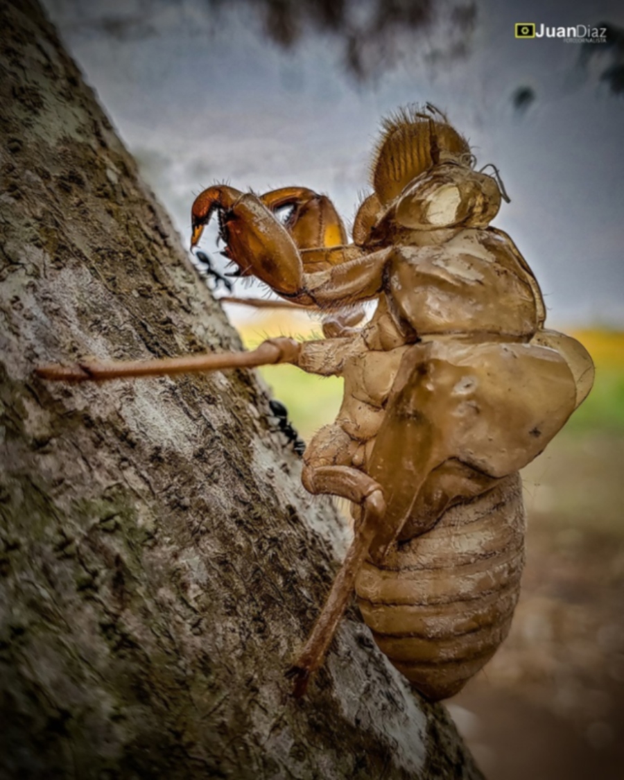 O fotógrafo Juan Vicente Diaz, publicou uma foto que chamou a atenção dos internautas. “A casca da cigarra” presa em uma árvore. Você sabia que a cigarra faz esta ‘troca