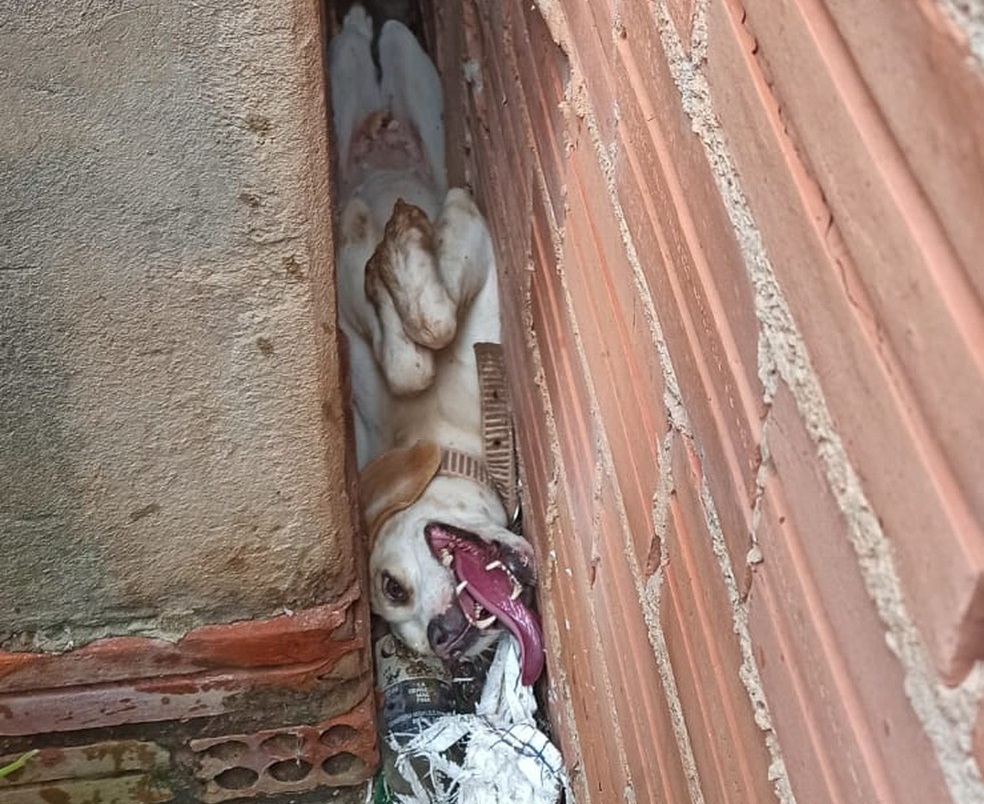 Uma cadela, chamada Laika, ficou entalada por várias horas entre duas paredes na cidade de Pimenta Bueno (RO), na Zona da Mata, na sexta-feira (1º). Segundo o Corpo de Bombeiros,