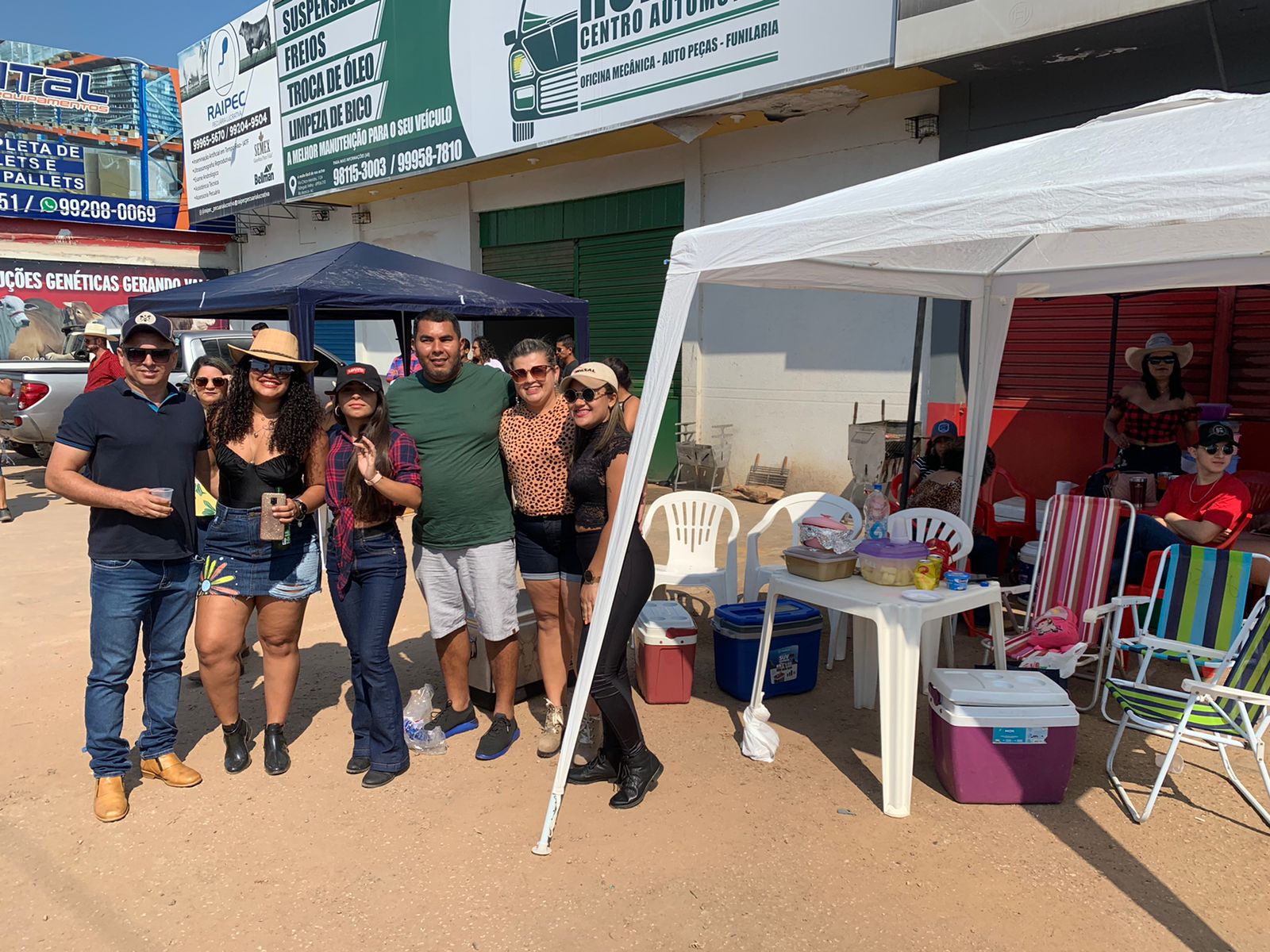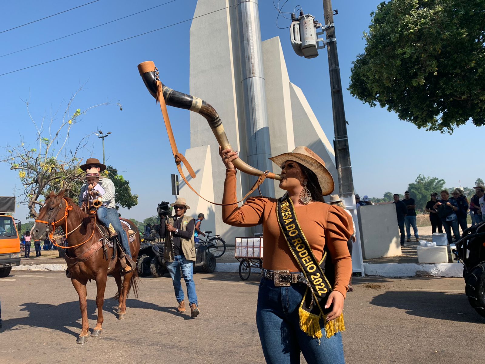 Ao longo da Via Chico Mendes, pessoas se concentram para ver a cavalgada passar. Entre camarotes de comitivas e barracas comerciais, a população aproveita para prestigiar o evento. O casal