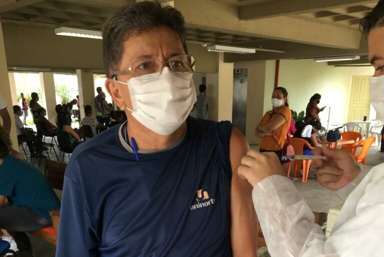 O servidor Sebastião Soares da Silva, que trabalha no Centro Universitário Uninorte no setor do almoxarifado, aos 70 anos, recebeu sua primeira dose da vacina contra a COVID na manhã