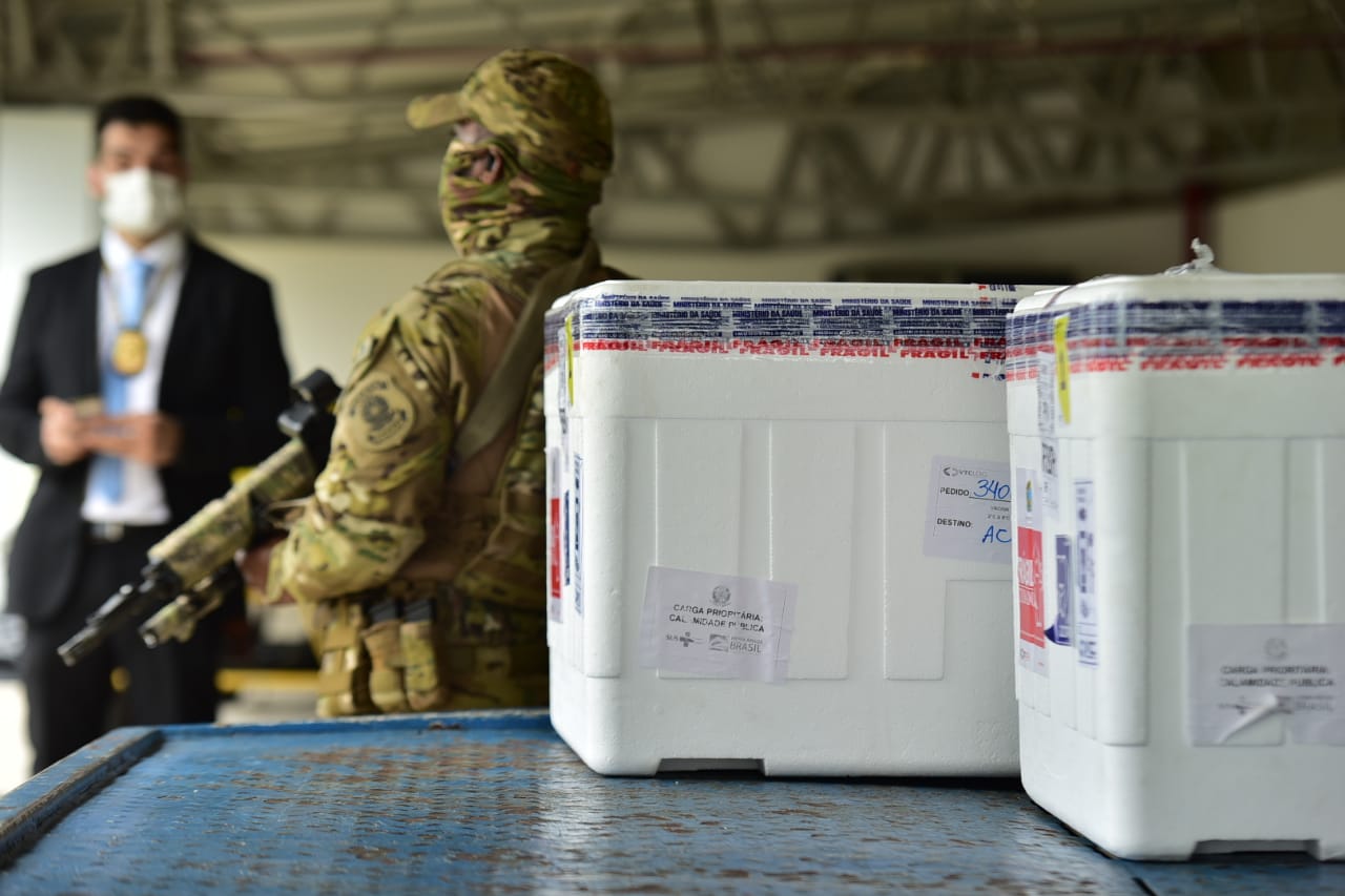 Desembarcou na tarde desta segunda-feira (8), mais 6.400 doses da vacina Coronavac à capital acreana, sob forte esquema de segurança O governador Gladson Cameli recepcionou os imunizantes que foram levados