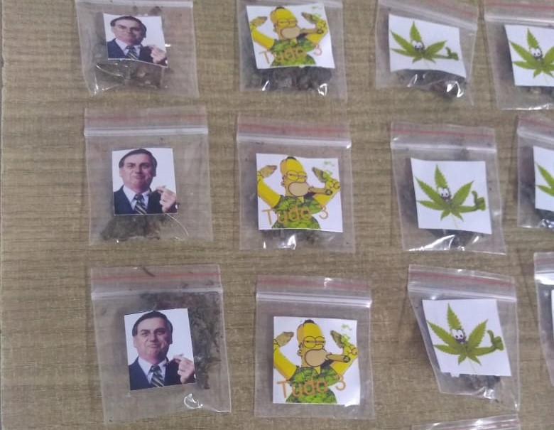 A polícia identificou que em vários saquinhos tinha a foto montada da imagem de Bolsonaro com um cigarro de maconha. A apreensão aconteceu em uma residência onde, segundo os policiais, seria um ponto de venda e consumo de drogas.