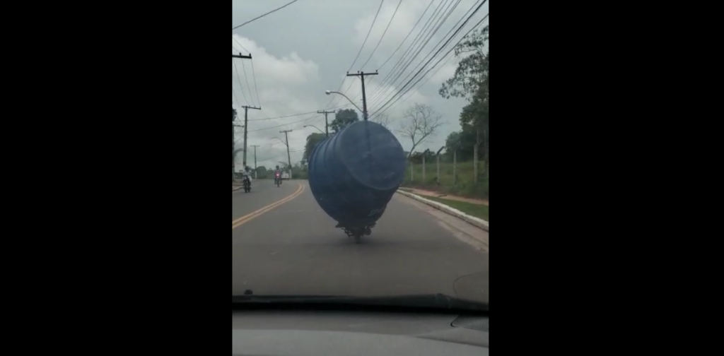 Cenas inusitadas foram registradas no último final de semana em Cruzeiro do Sul. Na Avenida 25 de Agosto, um homem foi flagrado transportando uma caixa d’água em cima de uma motocicleta. O fato se configura em uma infração de trânsito, mas chamou mais atenção pelo método como motorista e passageiro conseguiram transportar tal objeto, que deve ter cerca de 10000 litros.