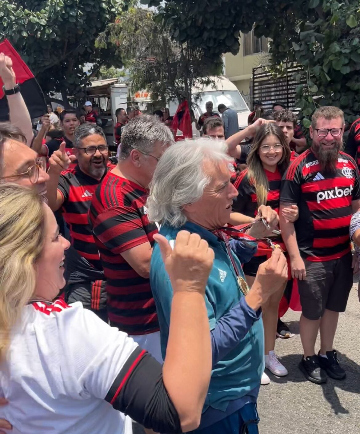 Assim que foi avistado, o sósia rapidamente virou alvo de pedidos de fotos e vídeos. Os gritos de “Mister!” ecoaram entre os rubro-negros, que aproveitaram o bom humor do personagem para relembrar momentos marcantes da passagem de Jorge Jesus pelo clube.