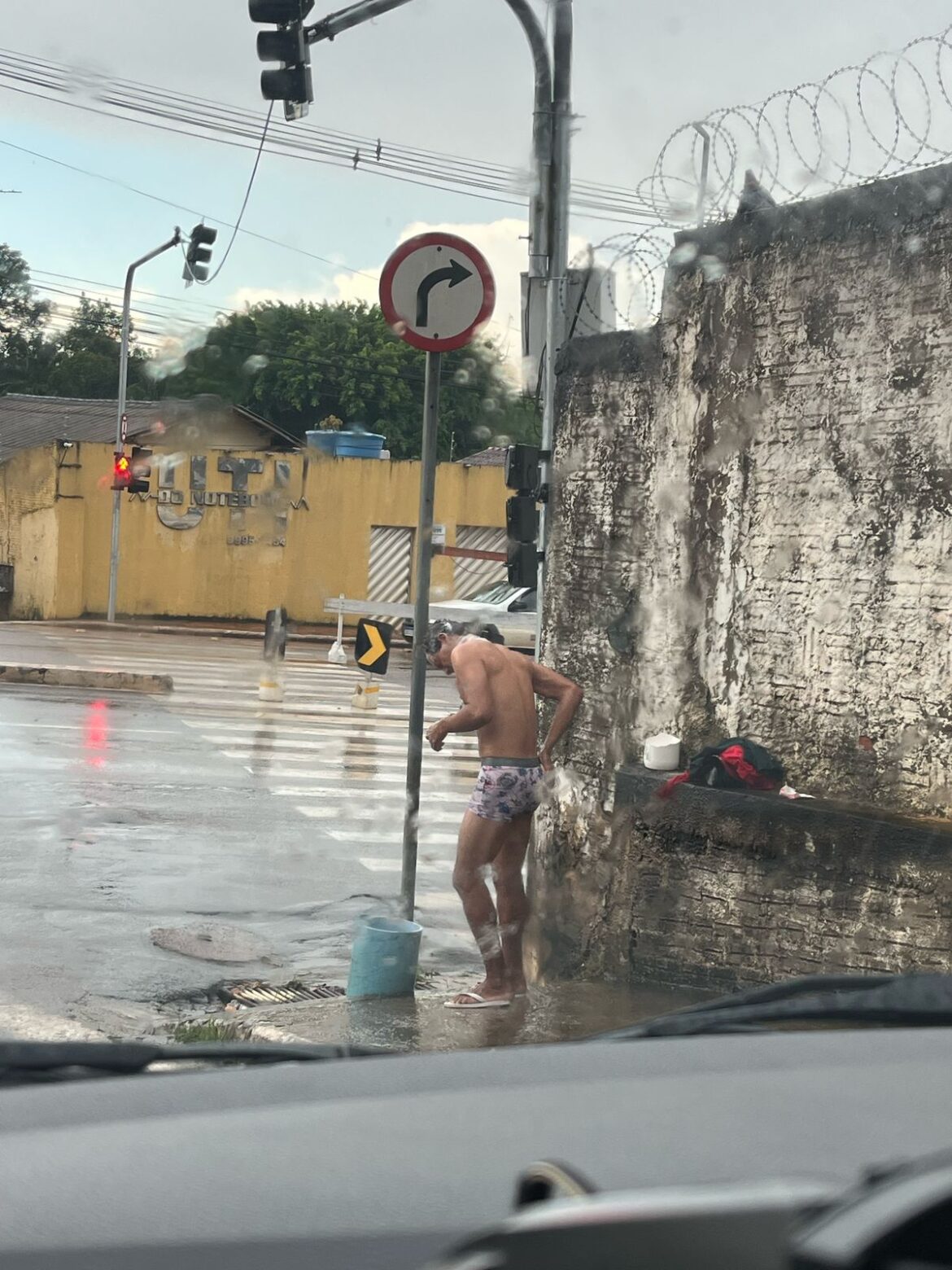 Nas imagens, é possível ver o homem usando apenas uma cueca, com um balde nas mãos, se ensaboando tranquilamente na esquina enquanto os carros passavam. A naturalidade com que ele realiza a higiene pessoal em plena via pública chamou atenção de motoristas e pedestres que testemunharam a cena.